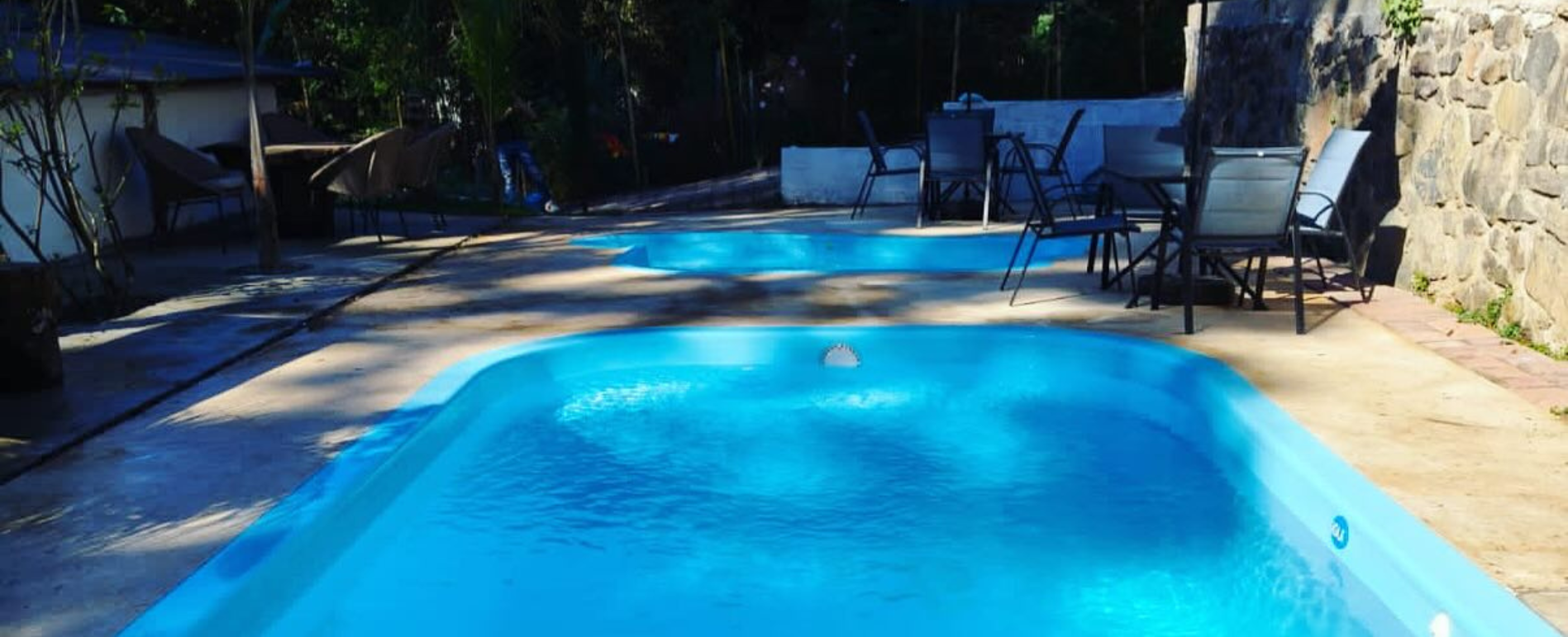 Una refrescante alberca, rodeada de exuberante vegetación, donde puedes relajarte y disfrutar del sol con tus seres queridos.